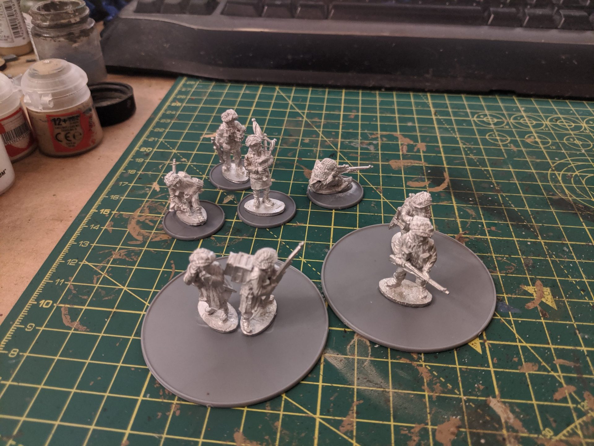 This week was a lot of assembly time, mainly because work is kicking my ass and I spent my Sunday running around fields playing ultramodern wargames in 1:1 scale (aka Airsoft). So the main thing was putting these WW2 brits on bases. The Support pack is all on 25mm bases to be used individually (although I’m not sure how much the piper will hit the table if I’m using him as an adjutant in Chain of Command). The two radio teams are going to be used as Jumping off points – effectively the troops being directed by NCOs taking orders from the radio squads. I’m not 100% sure of it but it should be dramatic on the tabletop.