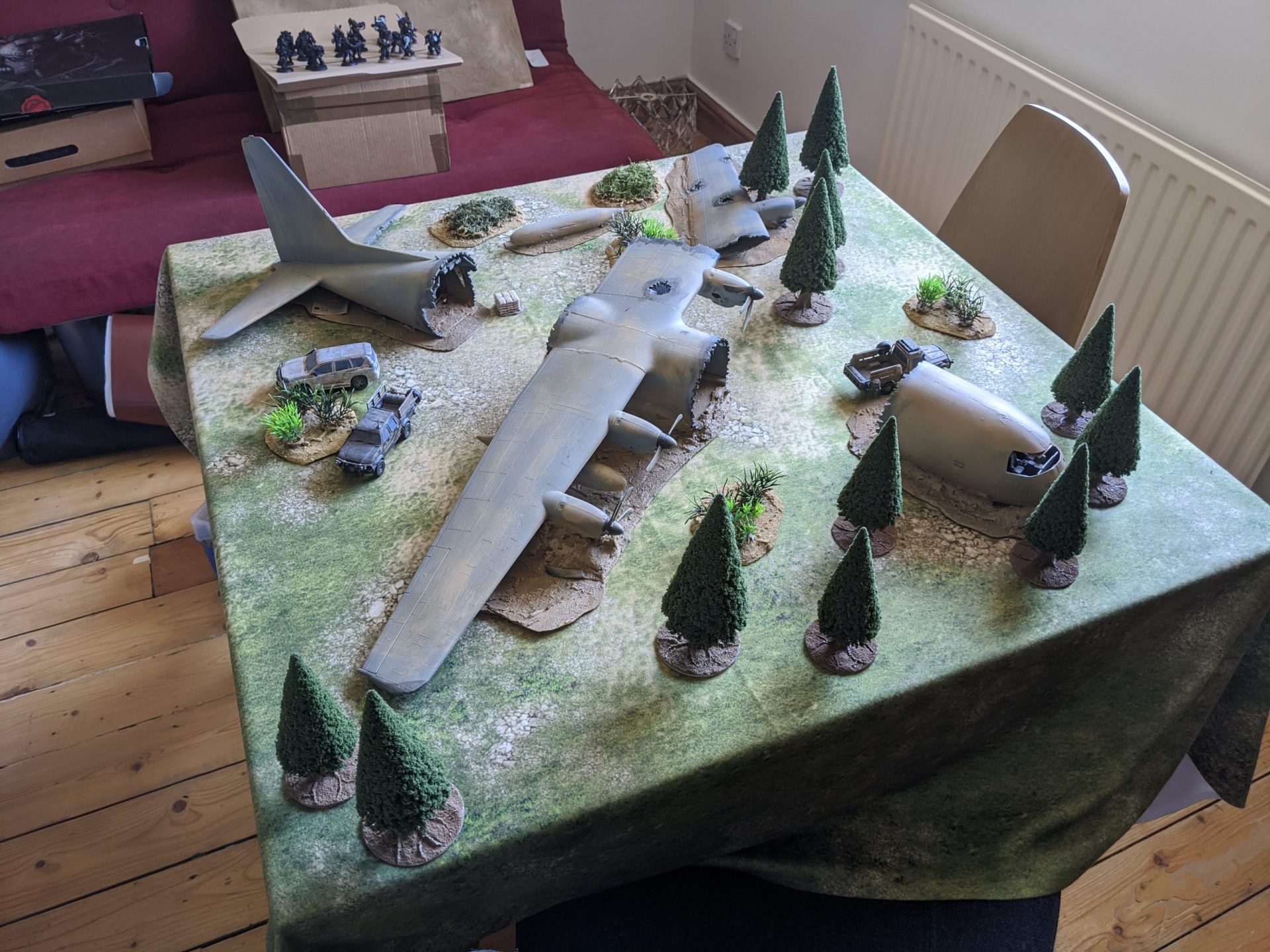 But more on topic, I’m setting up a tiny skirmish game to try out my own rules (once I finish writing them). Using the new Geek Villian mat and my downed C130, I think this could be a fun little skirmish between two groups of Special Forces operators.