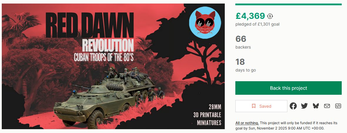Good news from Miska Miniatures – Red Dawn Revolution, their latest Kickstarter, has launched and is storming it’s way up through the goals. The Kickstarter already hit its goal (and then some), meaning that backers will receive 10 stretch goals with the possibility for more on the horizon. The different pledges give plenty of options for getting your hands on the Cuban forces, giving you everything from a simple squad all the way up to a unit with heavy mortars, ATGMs, grenade launchers and multiple vehicles. There are also several add-ons, including the figures from the first Red Dawn Kickstarter. The project runs until Sunday November 2nd, giving you plenty of time to jump in and get your own force over on Kickstarter.