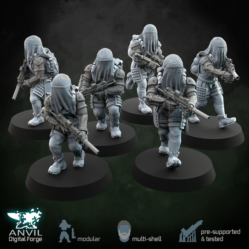 As well as a set of custom legs, the big addition is two different styles of combat divers. One set is equipped with the traditional oxygen tanks and mask (including a bump helmet to protect them), while the other set comes with the traditional mesh veil (as seen on Danish Combat Divers and game characters Nokk and Krueger). These will be both single-part figures as well as parts for the Regimental System.