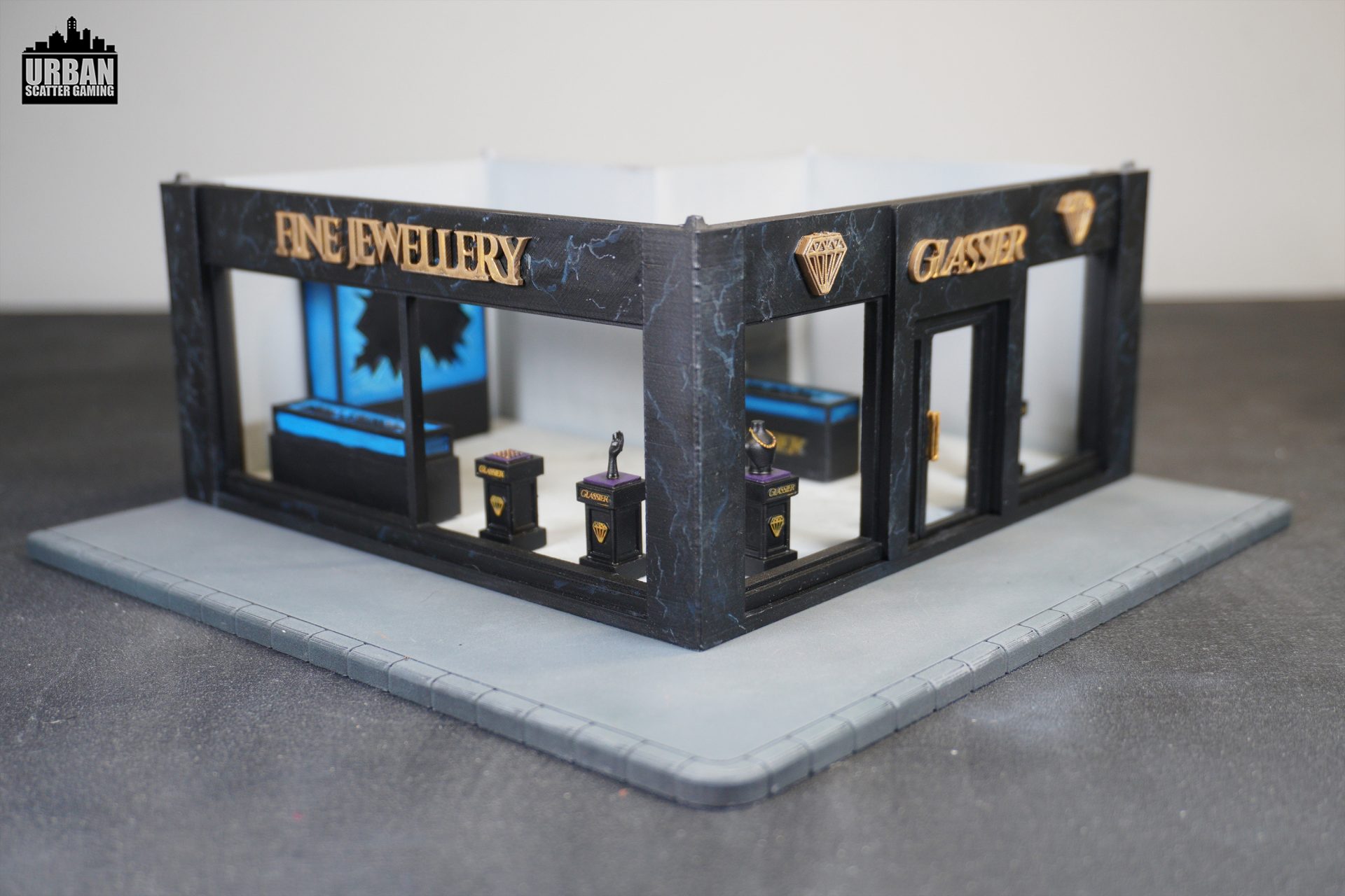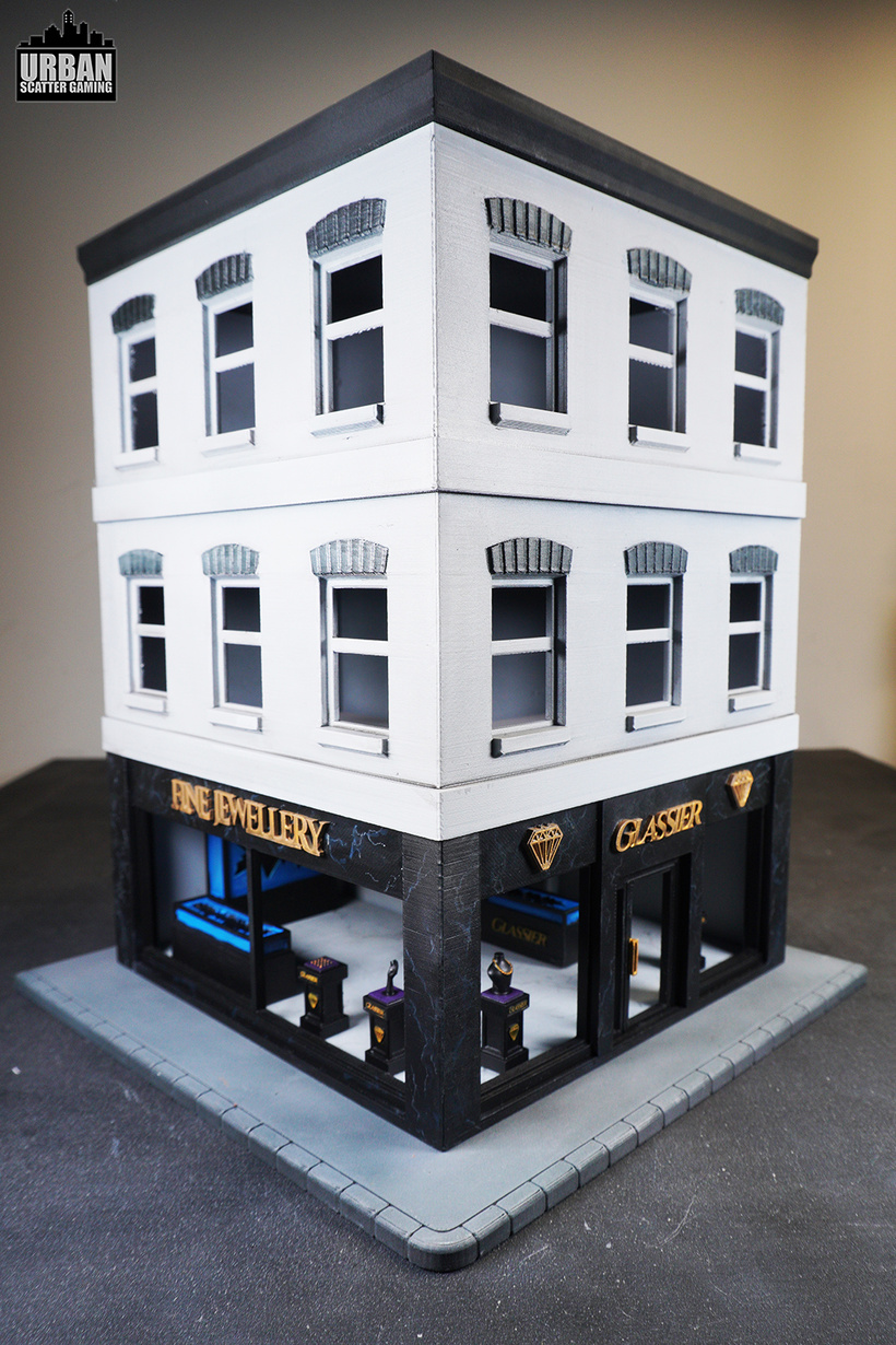 As previously previewed, this first building is a corner jewellery store, with a shop floor on the ground and space above. The building itself has a rear access door and brickwork, asking for some detailing. The shop floor itself can be printed at different orientations, allowing for greater flexibility.