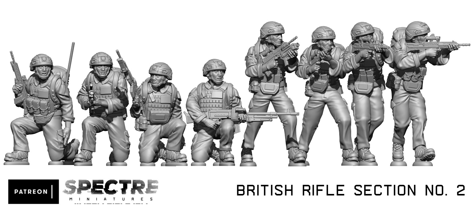First up, fresh off the weekend at Warfare, Spectre Miniatures has a new preview for the upcoming British release. This image, pulled from the Spectre Miniatures Patreon, shows off the second section for the full platoon, this time showing off the guys without full scrim helmets. The set has the same weapon mix as the first section shown last week, although this set is split into two style, showing a team split into assaulting and overwatch elements. The Assaulting team is moving in a stack, ready for entry, while the overwatch element (including both the L7 GPMG and the L129A1 Sharpshooter rifle) are crouched, preparing for the next part of the advance. Both teams are the type of poses I recognise from defence imagery pages, and I’m excited to see them in 3D. With the first set in full scrim and this second set wearing a bare Virtus helmet, the third set is going to be more sparse scrim, making all three sets ideal to mix together.