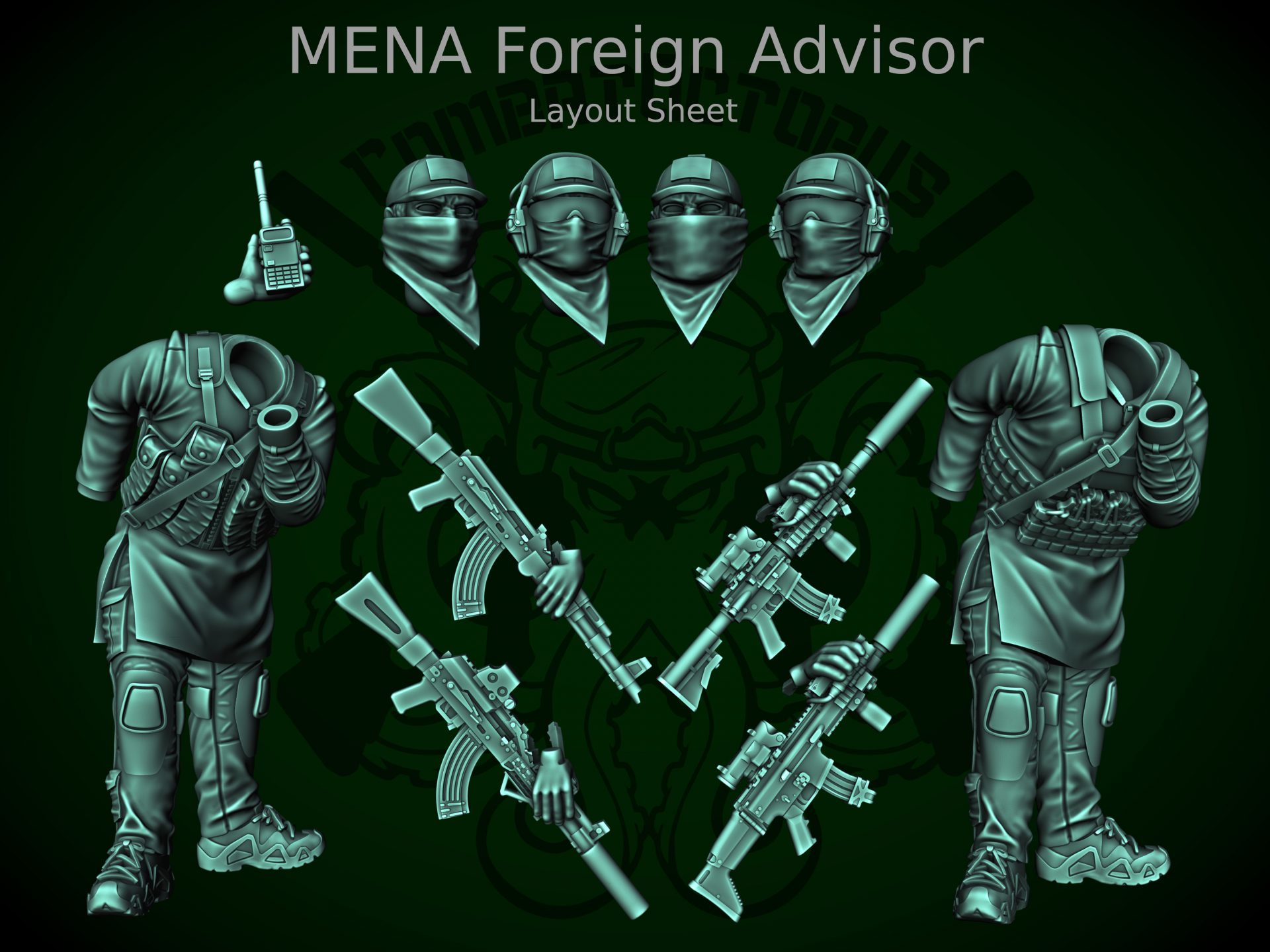 The other reward figure released last month was a foreign advisor figure for the MENA range. Posed with a rifle slung and peeking a corner (perhaps calling in support) this figure comes with four separate varieties of cap/balaclava combos and four weapon options (allowing for either more kitted out gear or fitting in with the locals). The two body variants come pre-equipped with pouches for both types of weapons, naming it easy to get him printed and jump in.