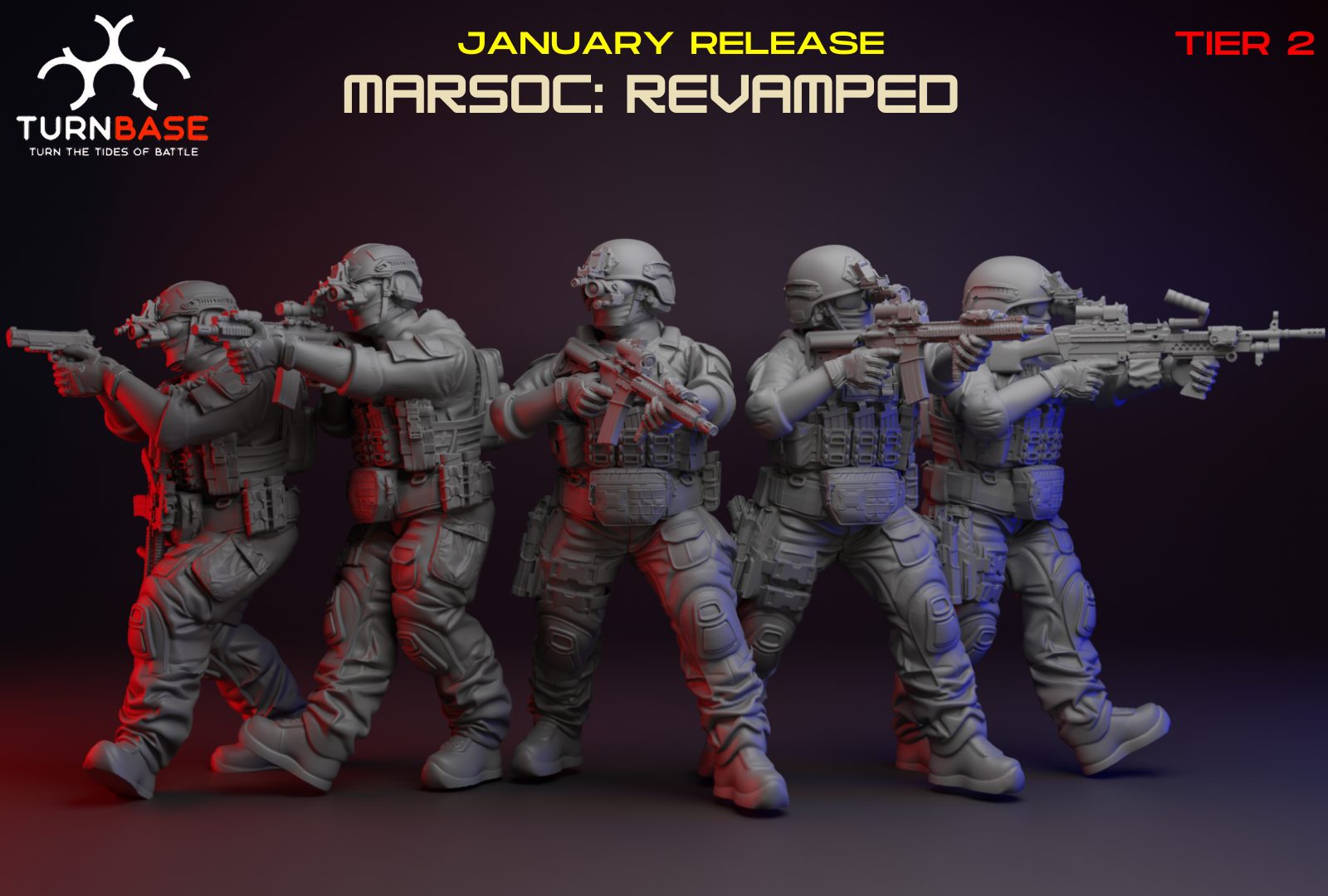 Turnbase Miniatures has shown off the Tier 2 release for January, bringing five MARSOC operators to the table. These are nice updates of the original set, bringing an LMG Gunner and four other operators (including one with an M45 drawn), while the grenadiers and anti-tank operators are coming in the Tier 3 set. Based on the description, these figures have modular heads, and you can see a mix of headgear (both FAST helmets and MICH) with both NVG and non-NVG options. No details on the release date, but it should be coming soon.
