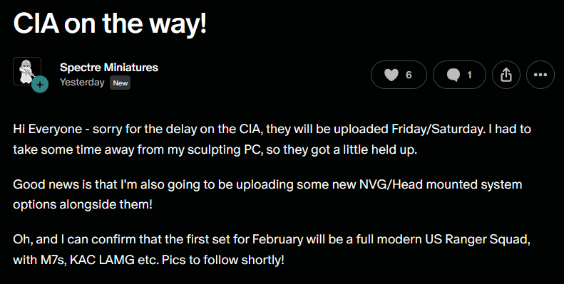This has been a quiet week for Spectre Miniatures fans who aren’t excited for Cosmic Horror’s launch on Kickstarter in March or interested in Out of Time. The only sign of life has been a single post on Spectre’s Patreon (pictured above) giving a generic “sorry for the delay”, some news about additional head-mounted systems to be included with the delayed CIA set and the news that this month’s main set will be a full modern US Ranger Squad with the M7 and KAC LAMG. This is a bit of a weird update post – why not mention to your fans about the fact that you’re in the middle of preparing for a Kickstarter, which might distract from sculpting time? Why not show off some of these head-mounted systems, be it the inspiration (or maybe play a little game with the hints)? And why, if the figures are so close to upload, would you not deliver another WIP preview of a figure to show things progressing? Hopefully, we’ll see the CIA set come out soon after this edition of The News Stand posts, but posts like this do give me a little concern – history may not be repeating itself yet, but I can already hear a little rhyming with the past.