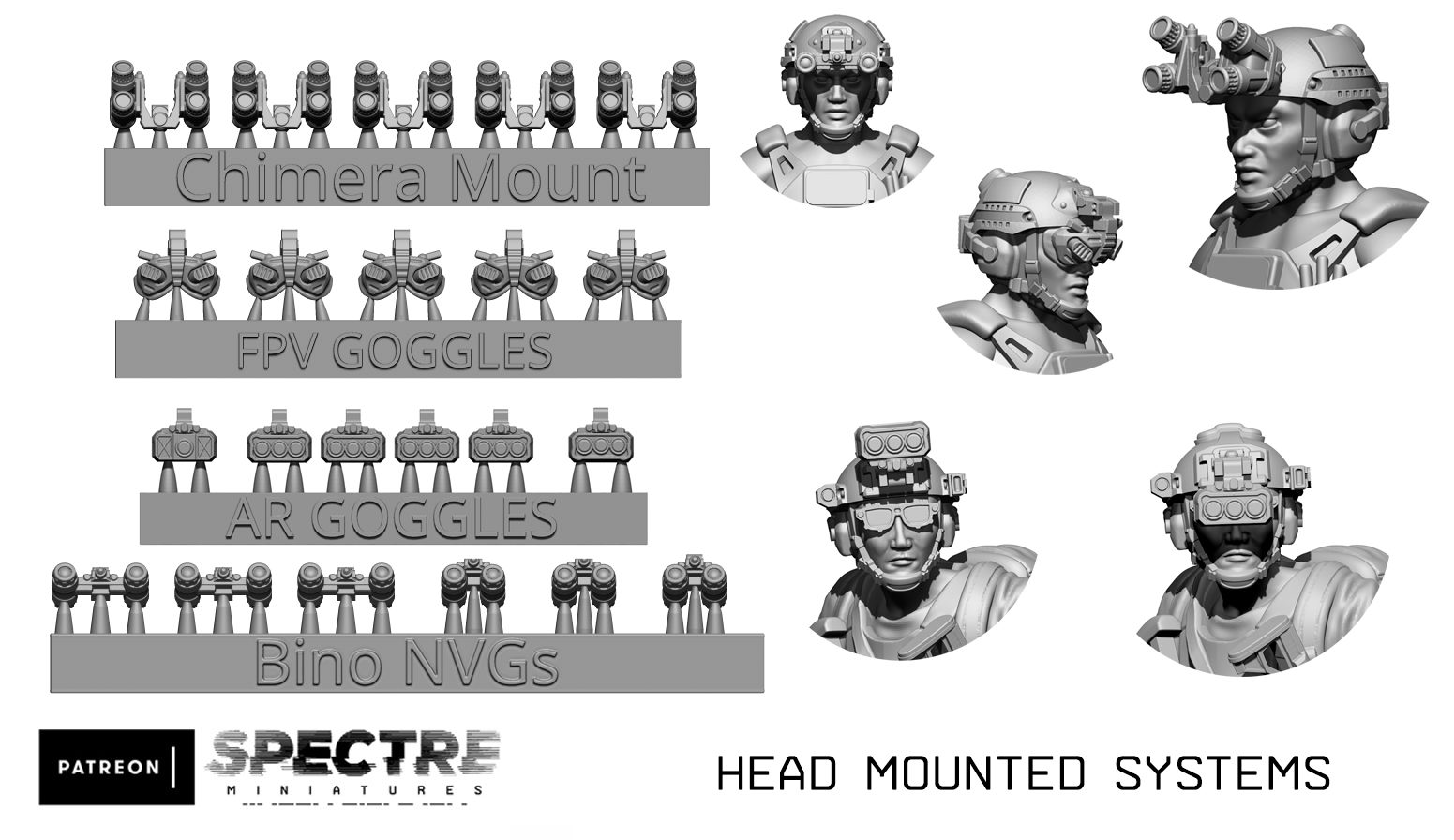 The other part of the release is a set of four items to use the mounts on all of the various helmets that Spectre releases have included. As well as an updated set of binocular NVGs based on the PVS-31s (including some deployed and others flipped out of the way), there are some weirder and wonderful ones. The Chimera Mount gives an alternative setup for panoramic night vision goggles, letting them be stowed out of the way without the downsides of more traditional setups. Above and beyond mere night vision, FPV Goggles and AR Goggles let your operators control drones and visualise the battle space. All of these sets are great for the large number of supported figures in the Spectre range (as you might expect from a company focusing on Special Forces), and having them as STLs means you can easily print off as many as you need.