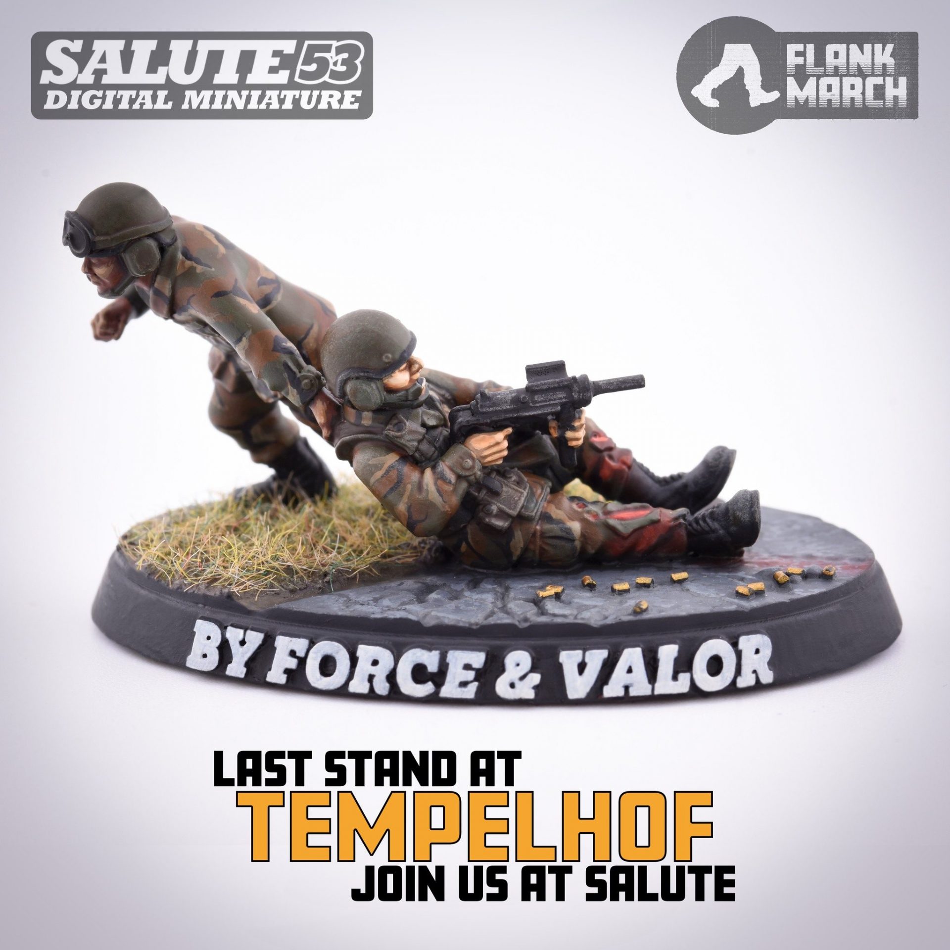 Flank March Miniatures has some good news for those going to Salute in April – attendees to the show will be getting this dramatic pair of US tank crew as part of their show guide (delivered via STL). The figure, showing a pair of tank crew escaping their armoured vehicle, the injured man firing off bursts from his M3 grease gun while being dragged away. This is inspired by the game Flank March will be running at the show, as the US Tankers deployed to Tempelhof Airport will defend against the East German Fallschirmjäger (brand new sculpts coming to Kickstarter later this year). Sadly, I won’t be available to go down this year, but this figure will be a great release for anyone wanting some cool markers for their knocked-out US tanks.