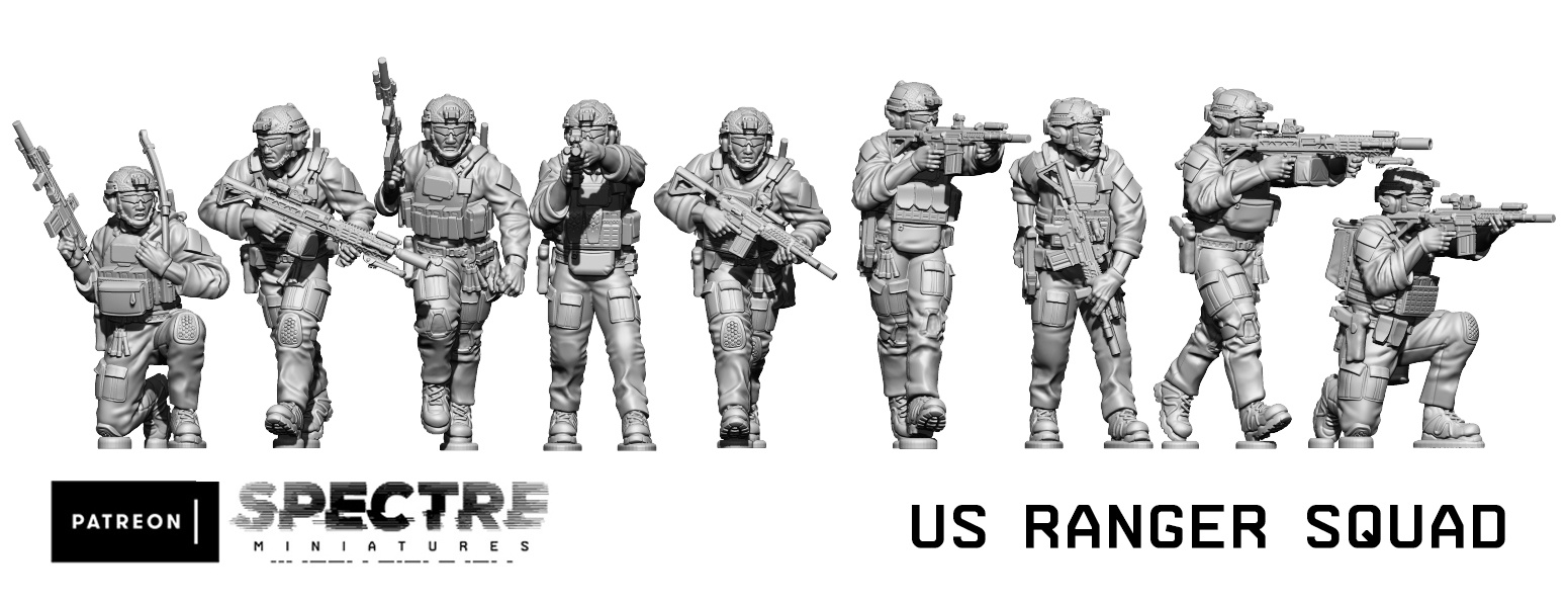 The bulk of the release is the new US Army Ranger squad. Spectre released a version of these guys back in the metal days of 2016 with BLOCK 2 carbines, SCAR-Hs and the MK 46 machine gun. This new squad brings us kicking and screaming into the near future, with the Rangers equipped with the M7 NGSW rifle, alongside the KAC LAMG and M320 grenade launcher holstered. It’s neat to see the details on this set, with a mixture of attachments on the M7s and different backpanel setups depending on role. I already have a set of these enroute to the printer.