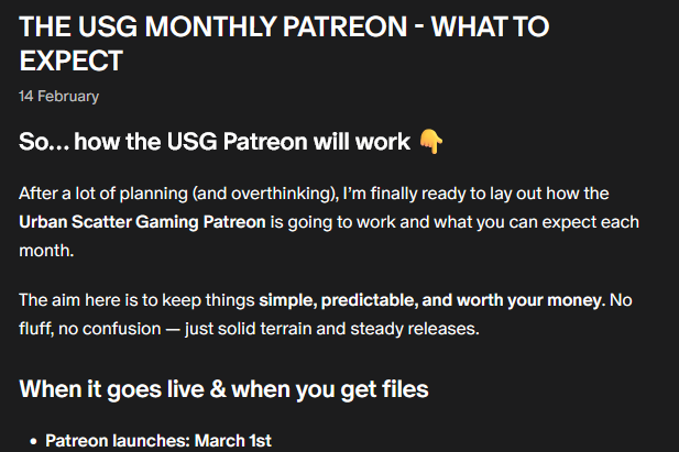 More good news from Urban Scatter Gaming – we have some plans for the upcoming Urban Scatter Gaming relaunch on his Patreon. You can find the details over on the Urban Scatter Gaming Patreon but roughly from the 1st of March, USG will be doing monthly releases to Patrons. Items will actually be released at the end of each month (on the last weekend), and will be available in three tiers – basic supporters, Builder (£10 for the full main building) and Designer (£15 for the building, matching details, scatter and even additional variants). Releases will also be themed, with the first six sets looking at the modern City feel. All of this sounds great, so stand by for more updates on what USG is up to.