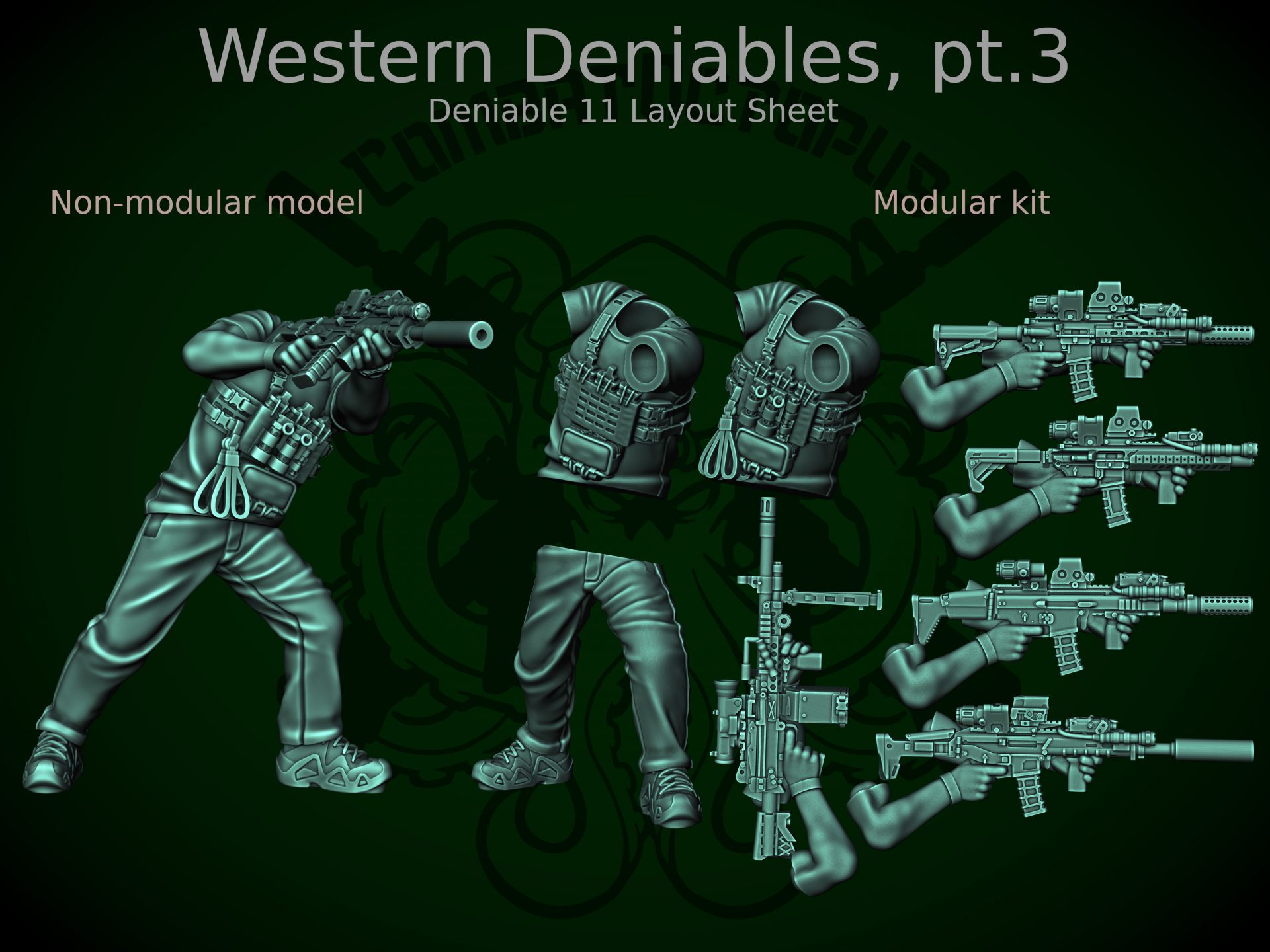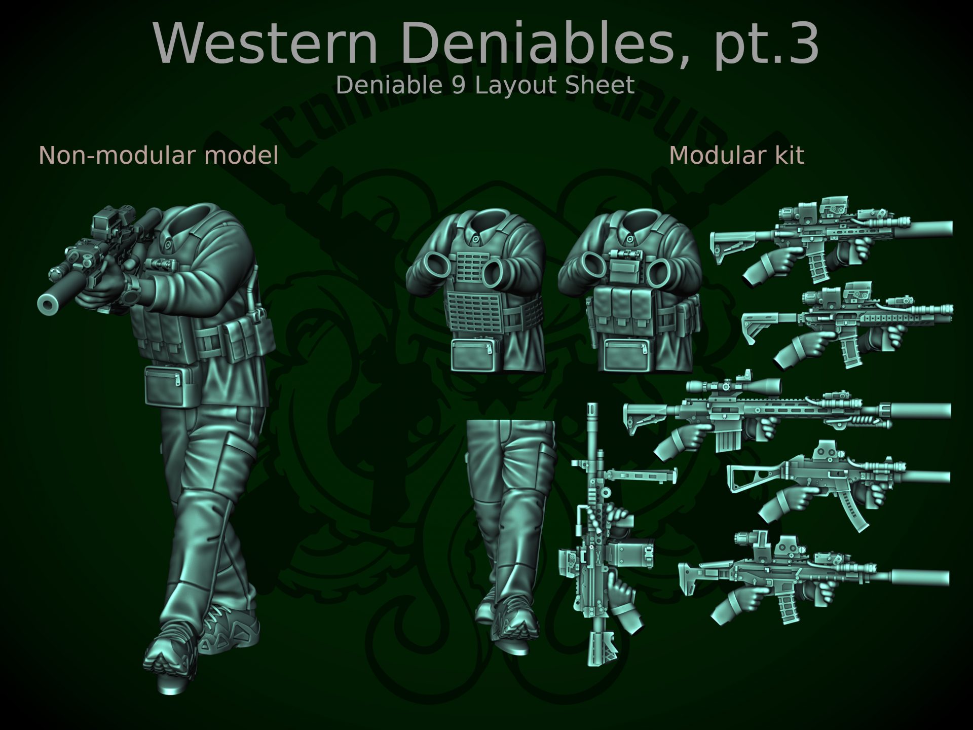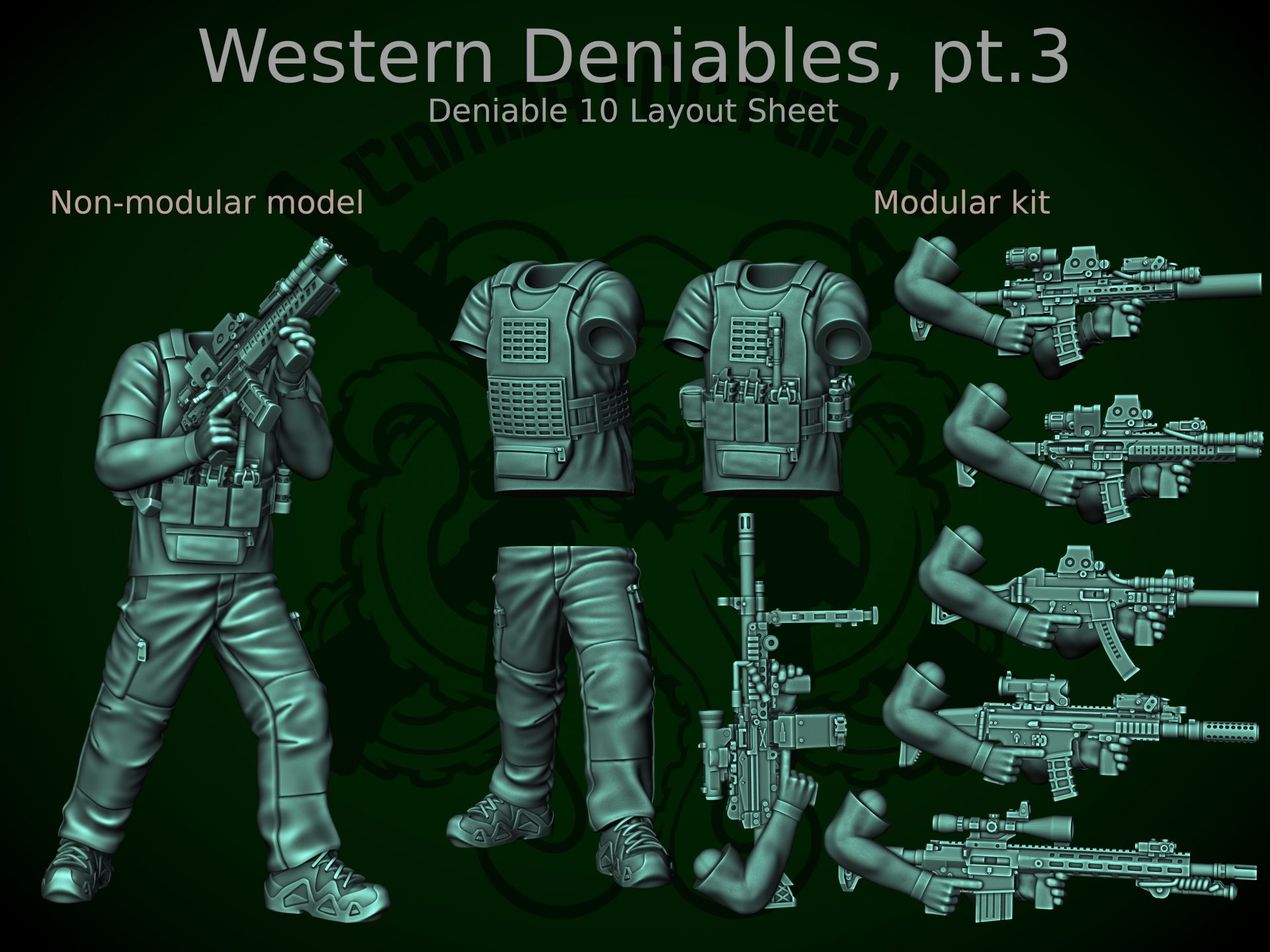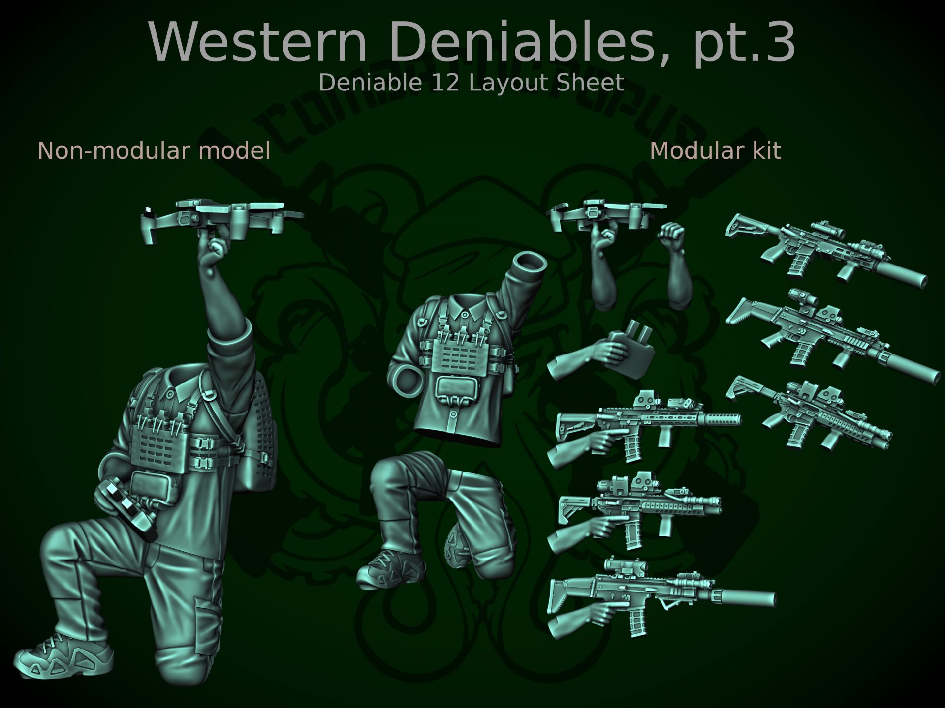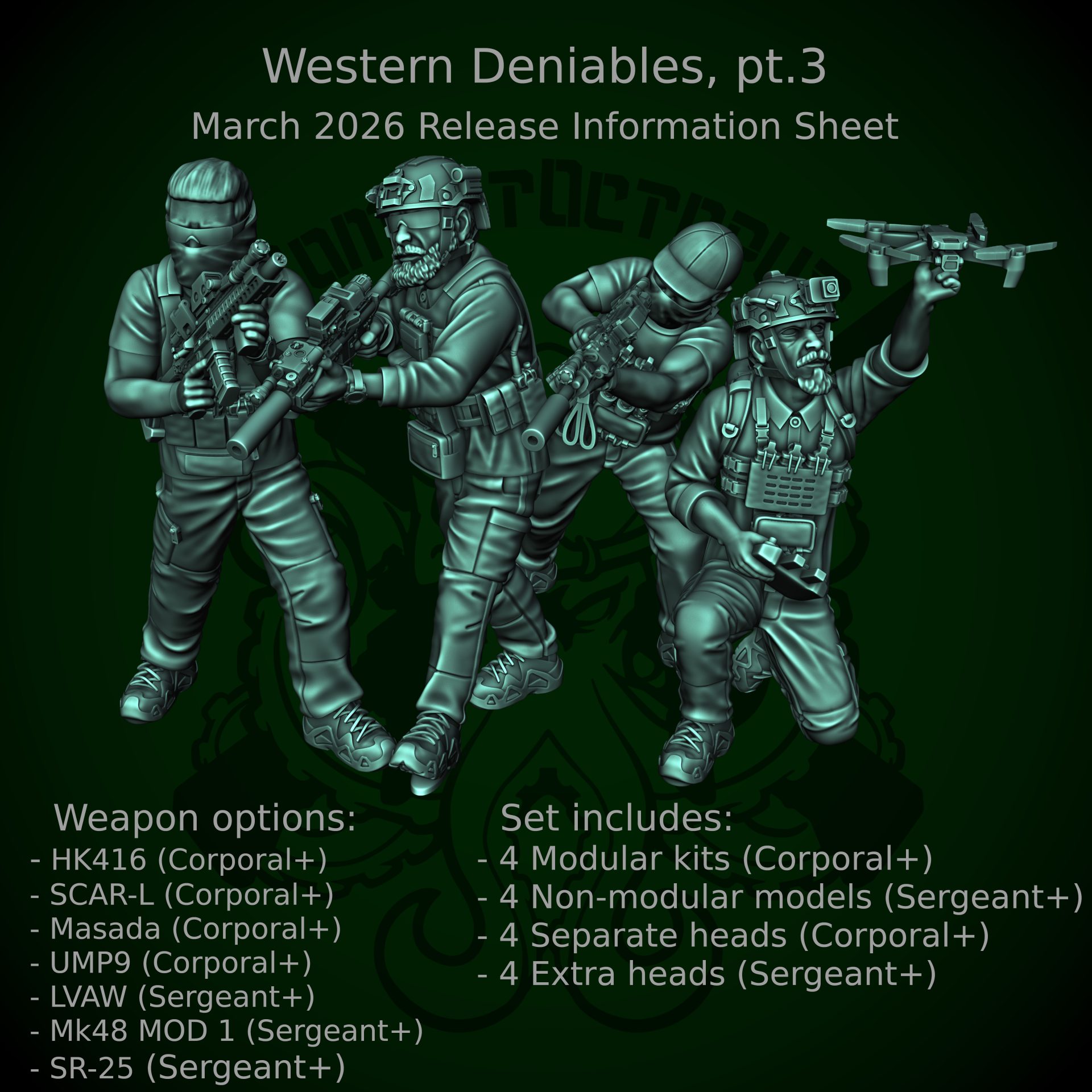 In terms of poses, we have the ever-useful high and low ready poses, we have an operator leaning around a corner, and we have a crouching pose that would work for either a drone user preparing to launch or a squad lead signalling to take a pause. All four poses have a pile of weapons (with most using all six weapons in the release), while having both loaded and unloaded vests gives plenty of options for customisation. The heads also bring some more variations, with a theme base baseballs caps for Corporal level and some more up-to-date OPSCORE wearers at Sergeant (including the ever useful glasses and masked face for when you need a lot of them). This pack is out now for Patreon backers, so sign up and get your deniables today!