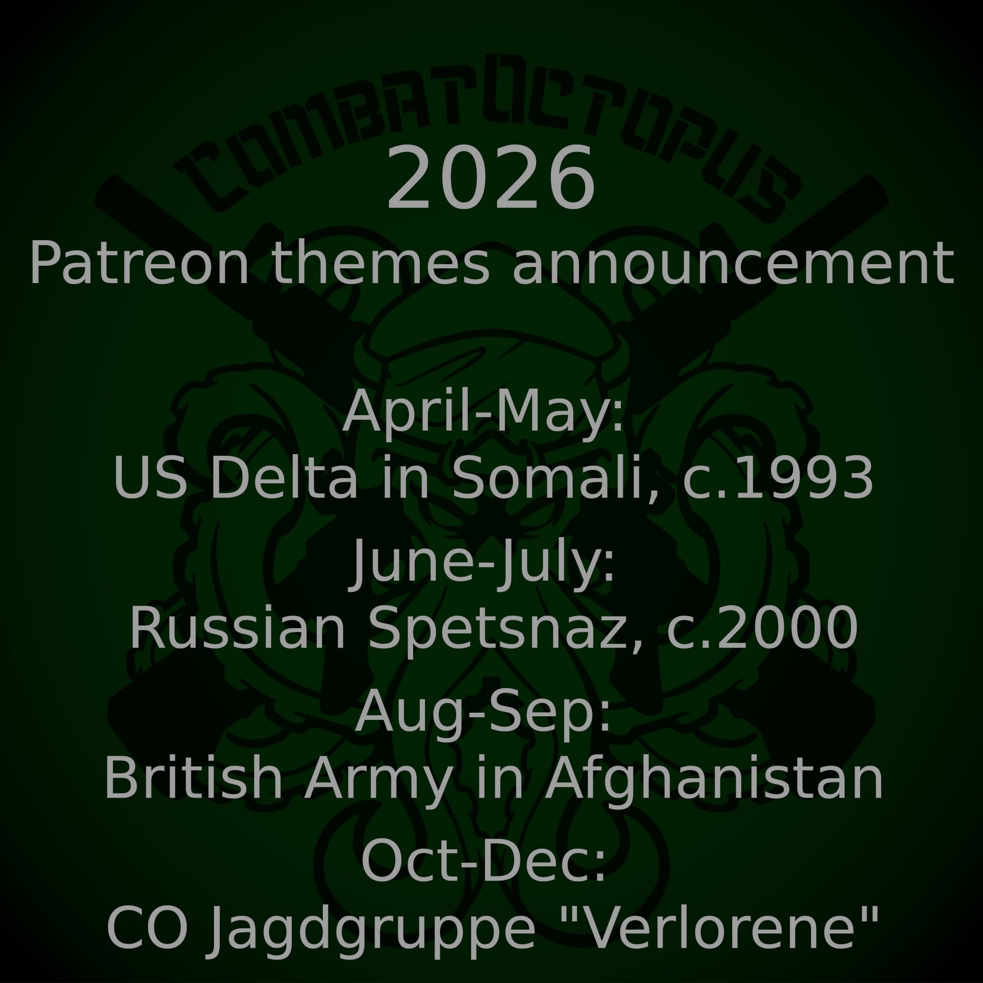 Finally, Combat Octopus has announced themes for the rest of the year. We had a preview for paid patrons back in February (which some moron reported on in his blog), but it passed the test, and now it’s out for everyone to see. We’re starting off with the D-Boys in Somalia for April and May, while June and July will bring 2000s era Russian Spetsnaz in Gorka suits for Chechnya operations (including their classic helmets for the era). August and September will be the British Army in Afghanistan (I am already preparing a rough guideline of the various looks of the era for CO to peruse) but the end of the year is the exciting one. Combat Octopus is getting to unleash his mind and take a look at his own custom setting with Combat Octopods Jagdgruppe “Verlorene”. A little bit SCP, a little bit spooky, these recce guys are going to be a homage to the Gebirgsjäger and Fallschirmjäger. Although not necessarily historical, these guys are going to be realistic and suitable to fit in with the rest of the collection (and probably very useful to those doing games inspired by Stalker, Tarkov or my new love Gray Zone Warfare). The three months will give us some combat operators, a group of enablers and then two sniper pairs. Overall, I am very happy to see Combat Octopus is doing the roadmap again, with plenty of details for each point, and I look forward to seeing these sets come out during the year.