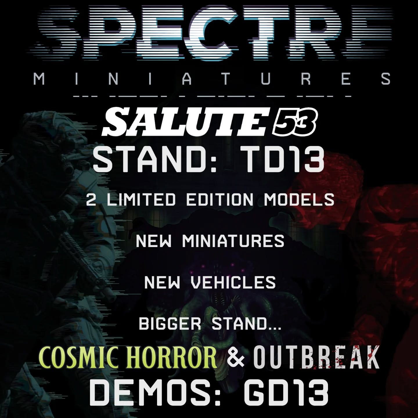 Spectre Miniatures, having just recovered from their time in the States, has been updating us on what’s coming next week at Salute. As you can see above, Spectre will be showing off a pile of things on a larger stand, as well as demos on the gaming row just next to the table (this year’s games are Cosmic Horror and Outbreak). There is also going to be a pair of limited edition models, and (up until just before I started writing this post), that was going to be all the details I had to share.
