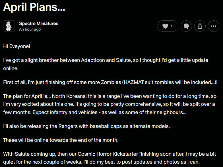 For those of us not going to Salute, April looks like it’s going to be a big month for those of us who have been eager for a trip into the Far East. In the latest post from theSpectre Patreon, this month will see both the zombies that were mentioned as being intended for March, but also the start of a new range of North Koreans. It sounds like this will be a long project as Spectre populates the region, with both a comprehensive release for the North Koreans and also their neighbours (although it’s unknown if it’s those to the North or the ones to the South). We’ll also be getting some variant models of the Rangers released earlier this year. On the other hand, Patreon will be a little quiet for the next few weeks as Spectre fights its way through both their biggest sales opportunity (Salute) and the end of the Cosmic Horror Kickstarter that is doing incredibly well.
