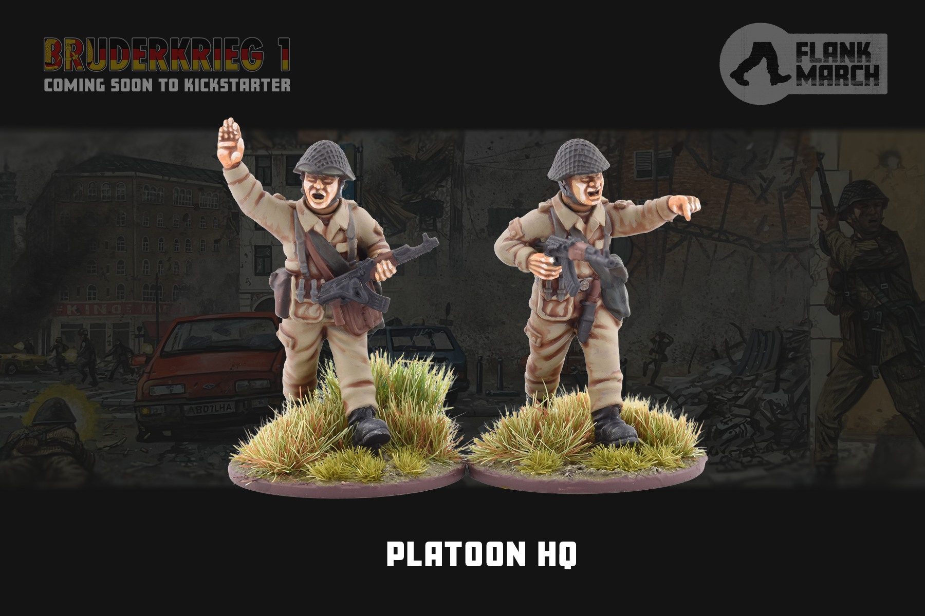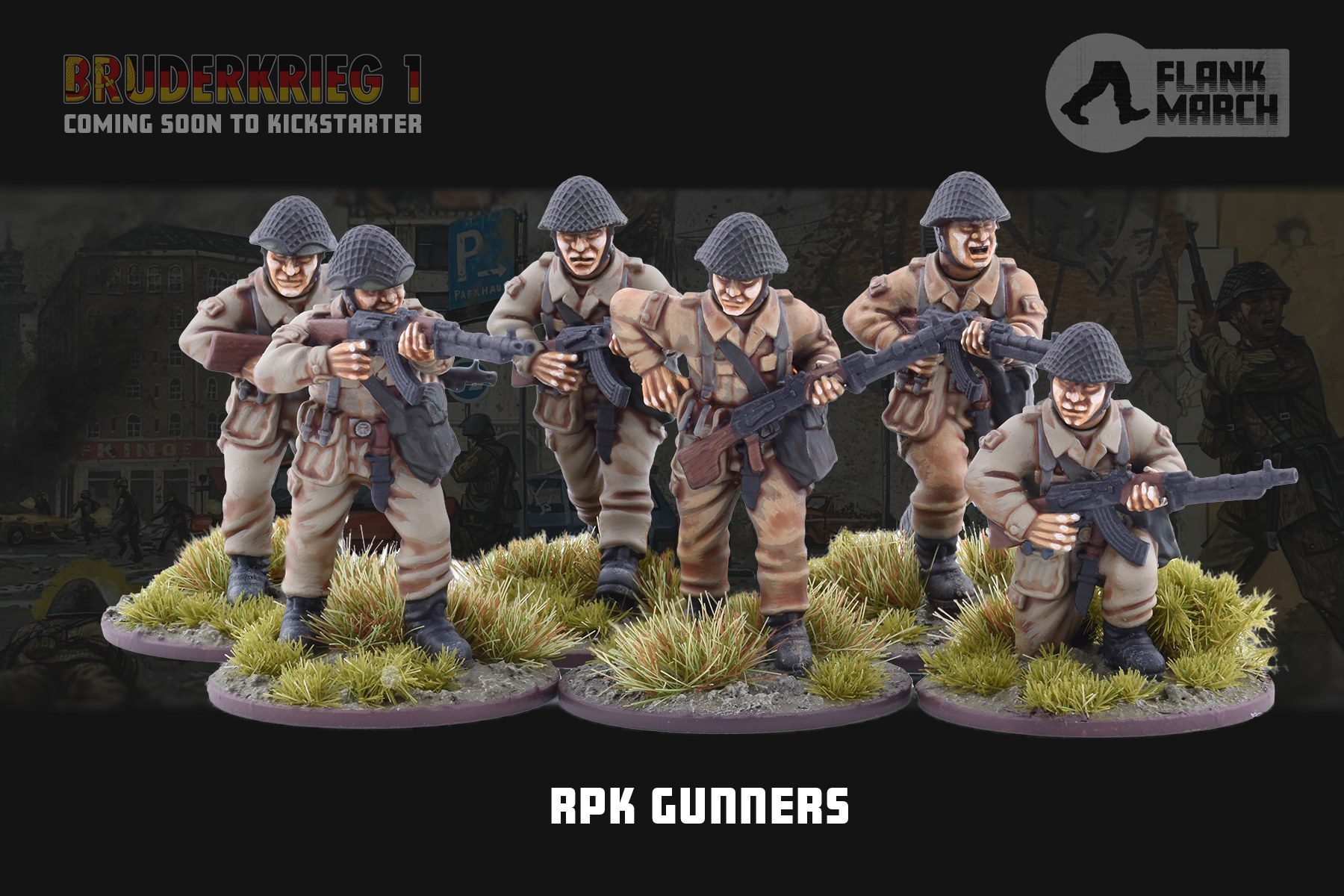 Speaking of which, we got a preview of three more pieces of the upcoming BRUDERKRIEG 1 platoon. With the core pledge intended to represent a Mot.-Schรผtzen Platoon, we’re getting a pair of figures for the Platoon HQ, a trio of Squad Leaders for each squad and oh god so many RPK gunners. The Mot.-Schรผtzen are based around the Soviet Mechanised model, with the entire platoon mounted in (and fighting alongside) BMP-1 IFVs. There is a lack of the Radio Telephone Operator seen in the US and British platoon HQs (a Funker will be among the stretch goals for people wishing to assemble the FJ or KDAs). Similarly distinctive is the number and choice of machine guns, a key element of squad composition. While the British go with a single GPMG, the Americans a single M60 and the Russians a single RPK-74, the East Germans go for a pair of RPKs in the same team within the squad – maybe not quite the same amount of raw firepower as a belt-fed, but definitely nothing to sniff at. All of these figures will be in the core platoon when the Kickstarter Launches, giving you all the tools you need to build your East German troops.